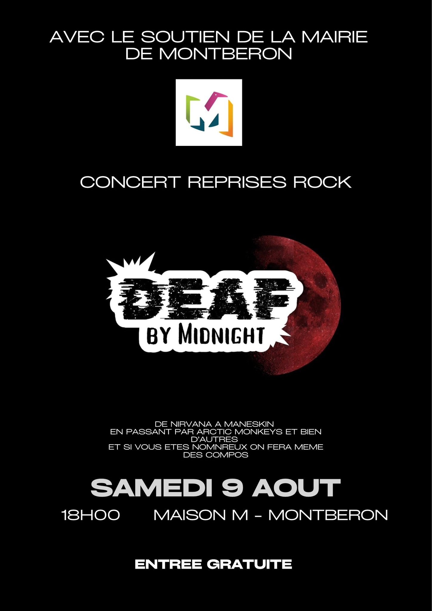Une actualité/événement de dernière minute! Samedi 9 août « DEAF BY MIDNIGHT » nous offrira sa première sortie publique à partir de 18H00, un after piscine à découvrir proposé par ce nouveau groupe dans lequel joue un jeune Montberonnais.